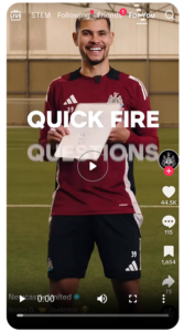 With new ownership and bold ambitions, Newcastle United made TikTok central to its global growth strategy. Working with The Social Co, the launch of the 2024/25 adidas kit drove 6m+ impressions, 400k new followers and 126k video likes, connecting with fans in key international markets. Now with 3.4m followers, @NUFC has extended the campaign to build momentum and strengthen global brand awareness through highlights, behind-the-scenes content and fan interactions.